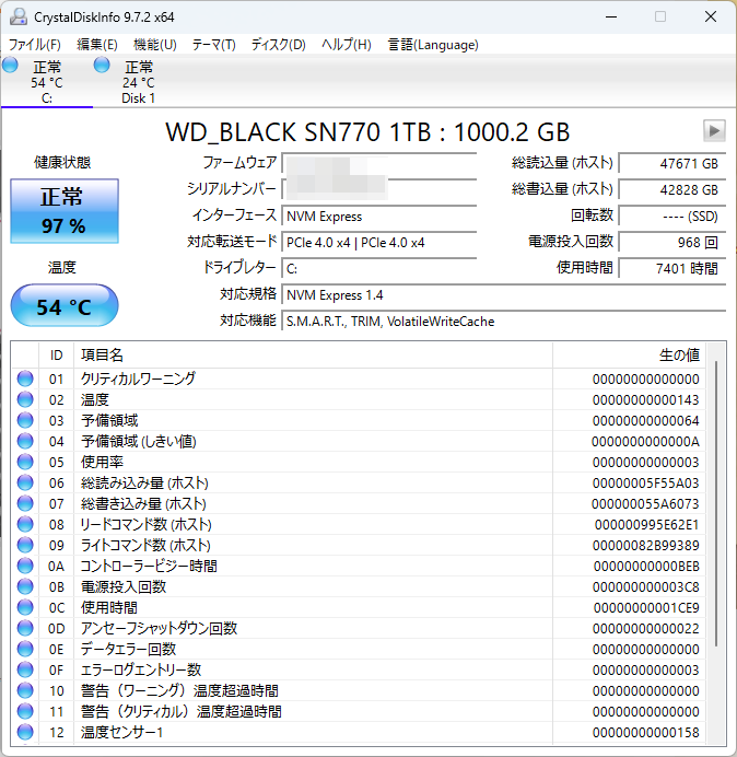ちなみに、今回インストールに成功した(以前からOSを入れていた)SSDはこちら。今回原因となったSSDは後から導入し、データ領域として使用していましたので、明らかに総読み書き量、使用時間が少ないのに…