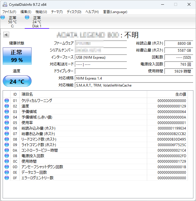 私も復旧後にCrystalDiskInfoで見たのですが、確かに表示がおかしいです。敢えてモザイクを甘くしているので、よく見るとわかると思います(笑)